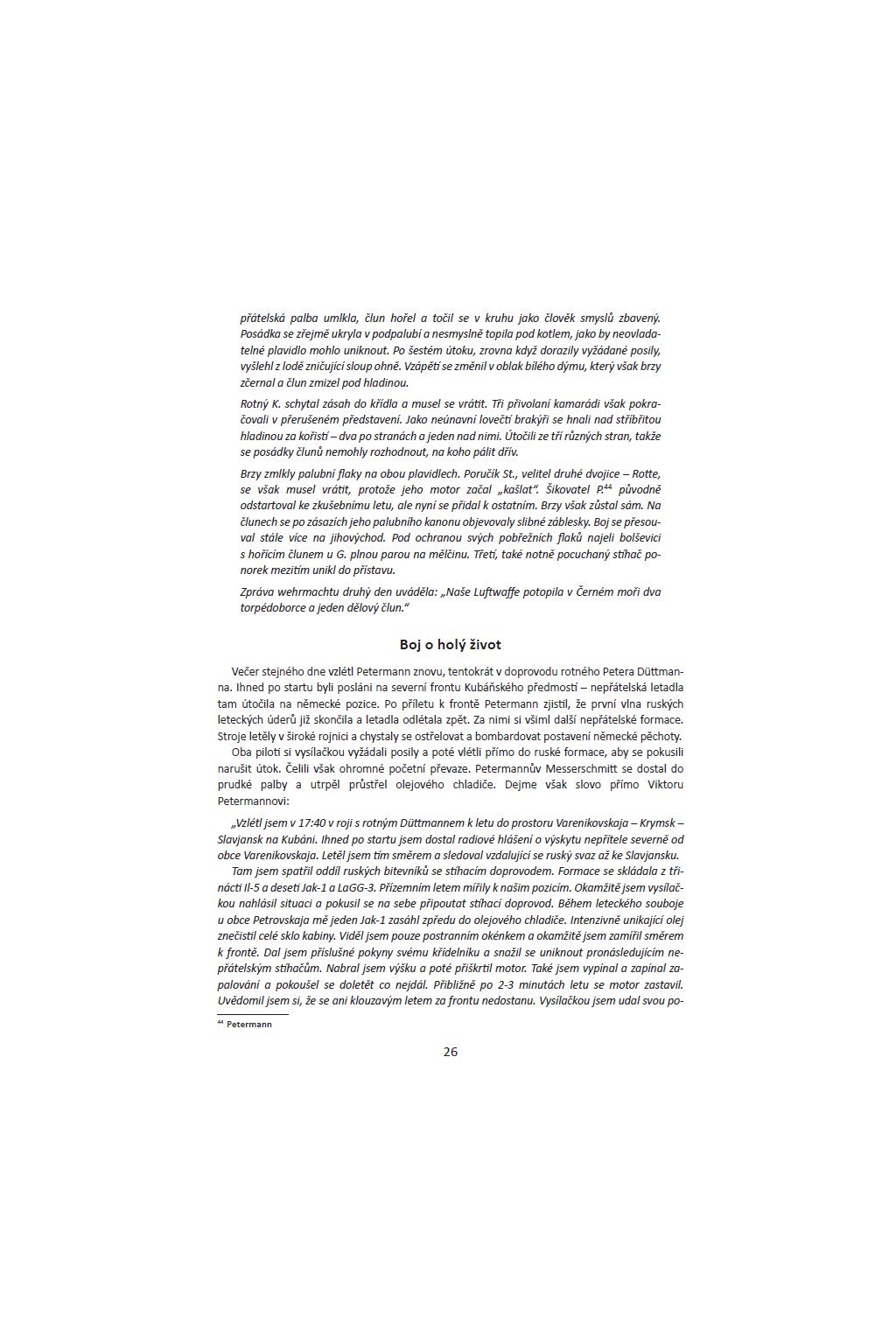 Kniha vypráví o jeho životě a především o bojové službě a poutavých zážitcích během stíhacích soubojů, ale útěku z nepřátelského území, kde havaroval. Součástí je i bohatá galerie osobních fotografií a dokumentů Petermann, stejně jako i stihací eskadry 52, ze které pocházeli nejúspěšnější stíhači všech dob, letecká esa Erich Hartmann, Gerhard Barkhorn a Gunther Rall.
